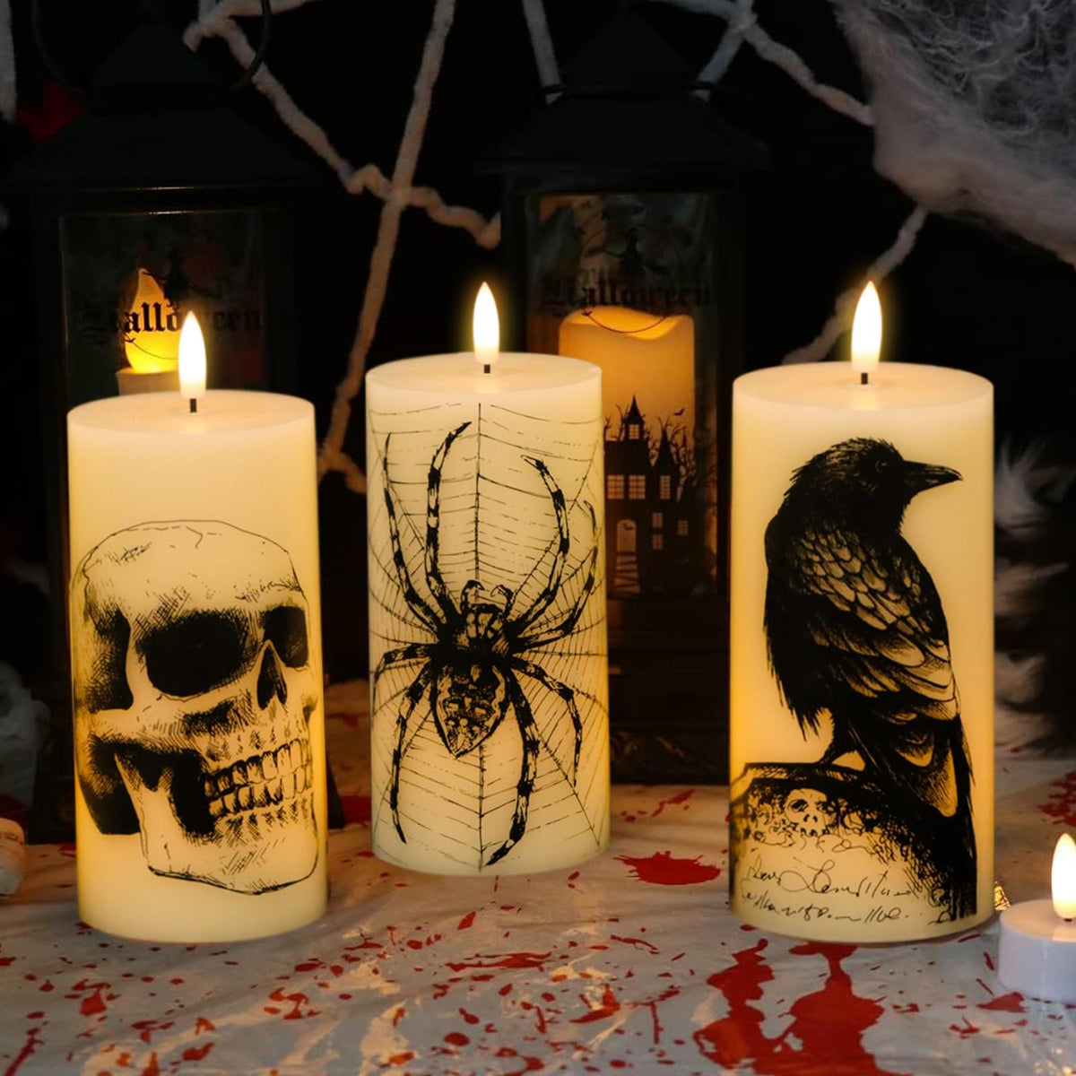 This 3-pack includes candles with three distinct Halloween designs: a black crow/raven, a skull, and a spider on a web. These eerie yet stylish decals instantly add a creepy vibe, making them perfect for Halloween parties, haunted house displays, or spooky mantel and tabletop decor.