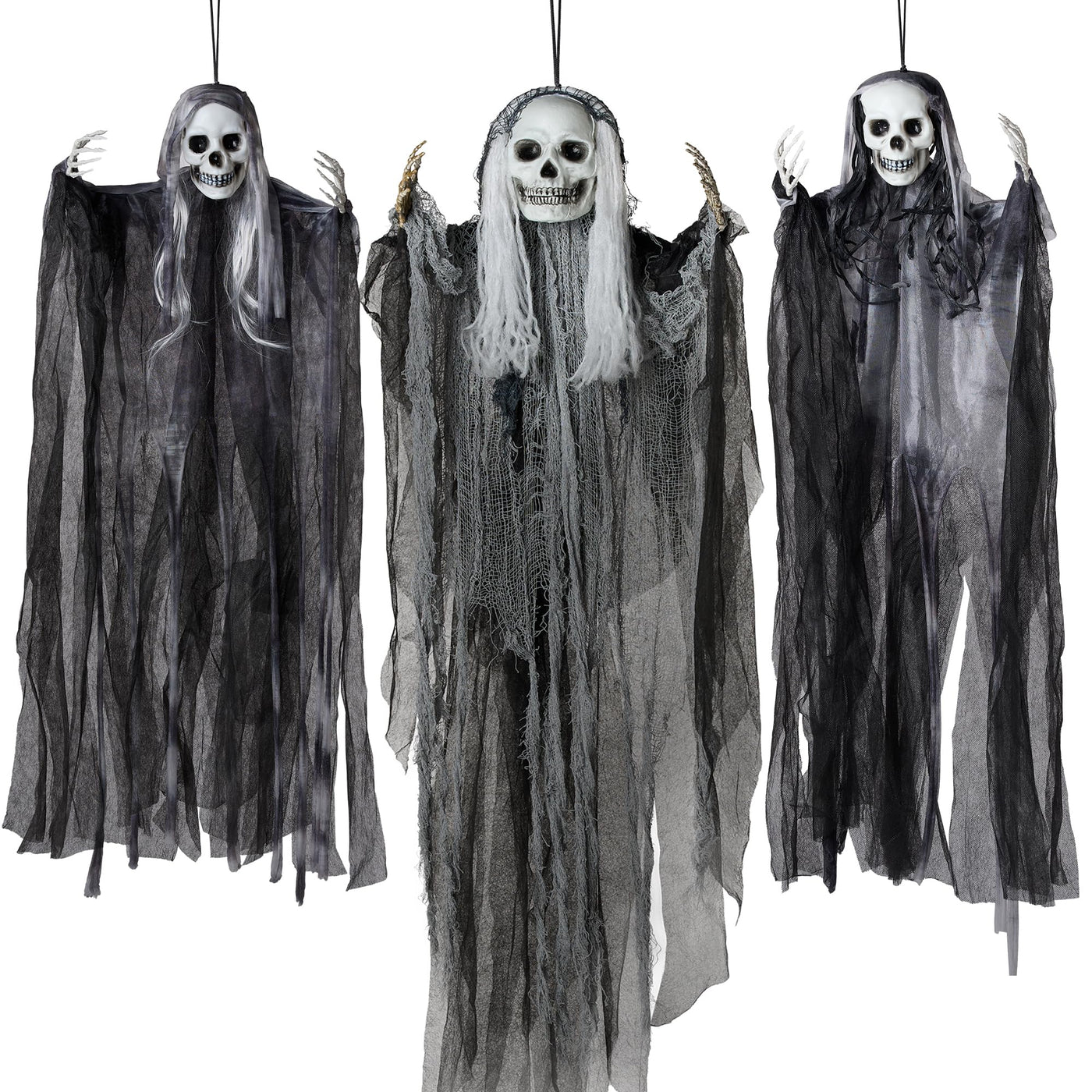 • GREAT VALUE SET: JOYIN set of 3 scary skeleton hanging grim reapers with different dress and size helps you create creepy and scary atmosphere for any Halloween events