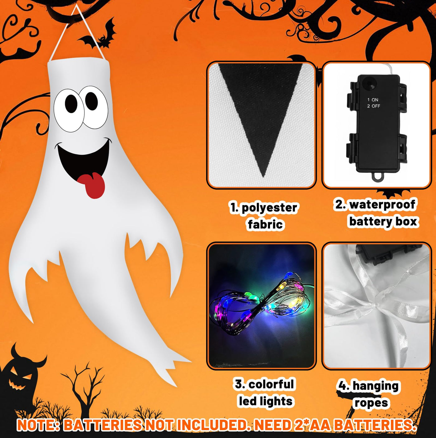 Halloween Ghost Decorations: 2 x Halloween hanging light up ghost decorations (measures 47.2inches/120 cm in height and 23.6 inches/60 cm in width), Halloween ghost decorations outdoor/indoor with cute and horrible expressions. Perfect Halloween gifts for your friends and neighbors to decorate their house and parties. NOTE: BATTERIES NOT INCLUDED. NEED 2*AA BATTERIES.